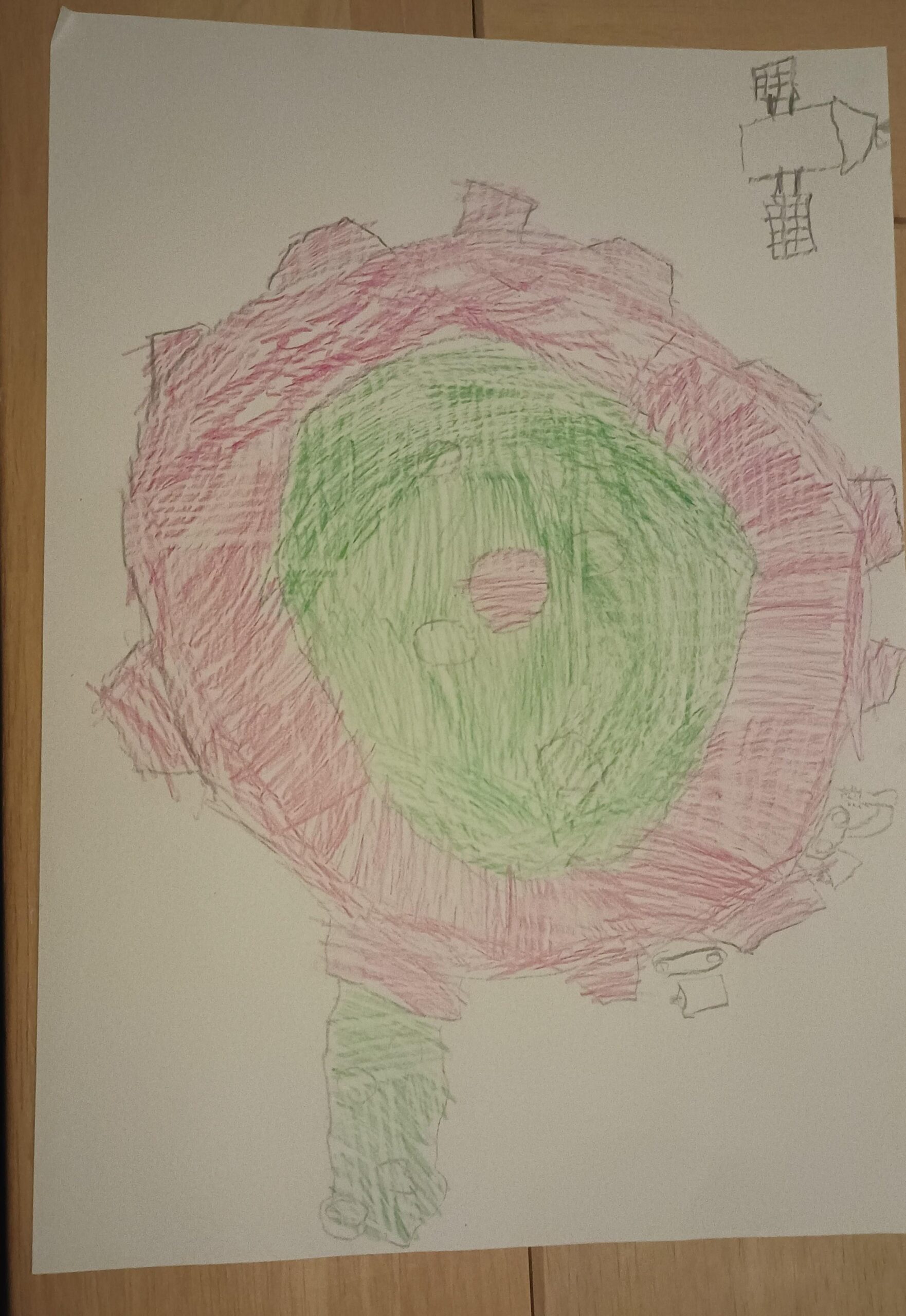 Max, 3 år: Thor med hans bukkevogn. De lyserøde prikker på hans mave er hans immunforsvar. (2020)